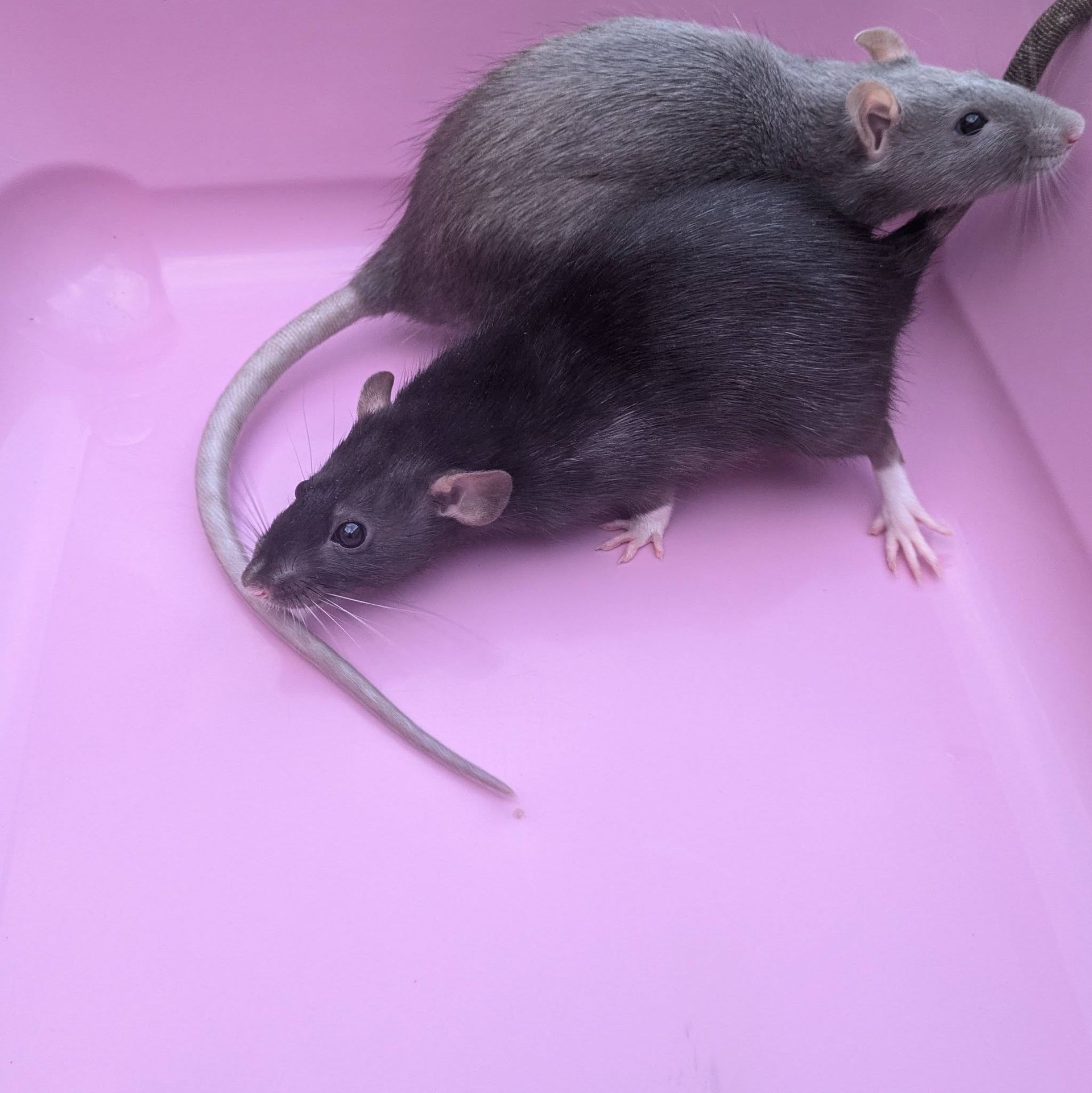 Character - Star (grey) is good to handle. Suki (black) is worried and will need some work on getting her used to handling.
